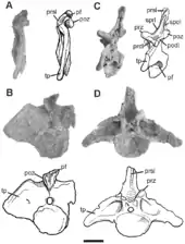 The holotype, MMCH-Pv 63-1, was found in a layer of the Bajada Colorado Formation dating from the BerriasianValanginian. It consists of a front tail vertebra. As paratypes were assigned: MMCH-Pv 63-2/3: two front tail vertebrae; MMCH-Pv 63-4: a hind tail vertebra, MMCH-Pv 63-5: a front dorsal vertebra, MMCH-Pv 63-6: a front tail vertebra; and MMCH-Pv 63-7/8: two vertebrae of the middle tail. Additional possible material has been discovered but was not referred as its identity was uncertain.[1]