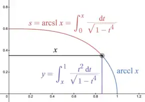 The inverse lemniscate sine also describes the arc length s relative to the x coordinate of the rectangular elastica.[9] This curve has y coordinate and arc length: