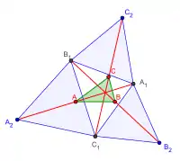 - If on A1B1C1 one makes the same construction as that on ABC, there will have three equilateral triangles A1B1C2, A1C1B2, B1C1A2, three equal line segments A1A2, B1B2, C1C2, which will also concur at the point P.