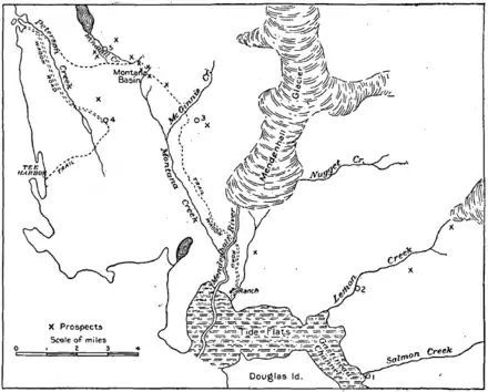 Its drainage area is about 30 square miles (78 km2), and its valley penetrates the Coast Range for a distance of about 8 miles (13 km) . From the south, there are several good-sized tributaries, and the uppermost of these side valleys contains a large glacier, which merges with the ice from the head of the main valley and extends to a point only 6 miles (9.7 km) from the mouth of the creek. The valley is a deep one, the surrounding Blackerby and Heintzleman Ridges rising to 3,500–4,000 feet (1,100–1,200 m), with peaks above 5,000 feet (1,500 m) in the headwater region. The stream bed lies north of the central line of the valley, and on this side the tributaries are closely spaced and their channels only slightly incised in the mountain flank. The grade of the main stream is somewhat irregularly distributed. The mouth of the valley is filled by a delta deposit raised only a few feet above high tide and extending upstream for something over a mile. Above this there is a short rock-cut canyon with a low waterfall or cascade at its head. Next comes a narrow stretch of gravelly bottom land expending upstream for nearly a mile and a half, with a grade of perhaps 200 feet per mile. Then comes a cascade, giving a rise of several hundred feet in a distance of half a mile, and above this the grade is somewhat more gentle, and short gravelly flats occur from place to place, separated by reaches of steeper slope extending to the foot of the glacier.[2]