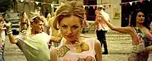 An accompanying music video for "Lemonade" was posted onto the YouTube channel of Stan's label, Maan Studio, on 4 June 2012[18] after it was previewed one day before.[19] It was shot by Iulian Moga in April 2012[19] at the MediaPro Pictures studios in Buftea, Romania.[4][5] The clip commences with Stan entering a kitchen wearing a red-white striped dress.[6] Subsequently, she is portrayed cutting lemons and making lemonade, following which she makes a phone call and walks down the street sporting a lemon-printed yellow dress and smiling into the camera. Next, Stan is seen singing in front of a red car, flirting with a man, which is followed by the appearance of two police men. They enter a store and the singer is presented selling lemons in the street. Afterwards, the video switches from color to sepia, as she is present at a block party; it closes with Stan posing in front of a backdrop designed with different types of shoes.[18]