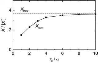 Different corrections schemes have been developed to account for the influence of the long-range interactions in simulations and to sustain a sufficiently good approximation of the 'full' potential.[6][31] They are based on simplifying assumptions regarding the structure of the fluid. For simple cases, such as in studies of the equilibrium of homogeneous fluids, simple correction terms yield excellent results. In other cases, such as in studies of inhomogeneous systems with different phases, accounting for the long-range interactions is more tedious. These corrections are usually referred to as 'long-range corrections'. For most properties, simple analytical expressions are known and well established. For a given observable , the 'corrected' simulation result is then simply computed from the actually sampled value and the long-range correction value , e.g. for the internal energy .[31] The hypothetical true value of the observable of the Lennard-Jones potential at truly infinite cut-off distance (thermodynamic limit) can in general only be estimated.