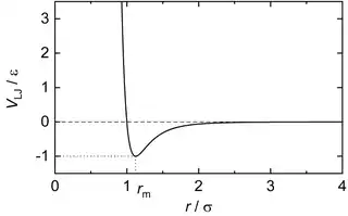 where is the distance between two interacting particles, is the depth of the potential well (usually referred to as 'dispersion energy'), and is the distance at which the particle-particle potential energy is zero (often referred to as 'size of the particle'). The Lennard-Jones potential has its minimum at a distance of , where the potential energy has the value .