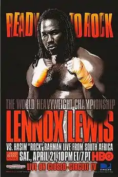 Following his upset victory, Rahman became an overnight sensation. Less than a month after his victory, Rahman signed a $5 million deal with influential promoter Don King.[8] Shortly before joining King's stable, cable giants HBO and Showtime entered into negotiations with Rahman in an attempt to get exclusive rights to air his fights. Showtime offered Rahman an estimated $19.25 million to sign with them and face their premier fighter Mike Tyson in the first defense of his newly won titles, while HBO offered Rahman $17 million to instead face Lewis in a rematch, but Rahman turned down both offers and instead agreed to a match with Danish fighter Brian Nielsen that would earn him an additional $5 million.[9][10] The Rahman–Nielsen fight fell through, however, and it was announced in June that Rahman would defend his titles against David Izon.[11] Lewis, however, had a rematch clause in his contract and went to court in hopes of gaining his rematch with Rahman and in June, a judge ruled in Lewis' favor, giving him the legal right to face Rahman for the titles. In August, both sides were able to reach an agreement and the rematch was announced for 17 November 2001 in Las Vegas.[12] Lewis avenged the defeat, regaining the heavyweight titles via fourth-round knockout.[13]
