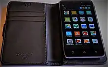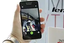 The Lenovo Vibe Z is a high-end Android smartphone that accepts dual SIMs. It is 7.99 mm thick and has 5.5-inch display.[48] The Vibe Z uses a relatively large 1/3.06-inch backlit camera sensor paired with a f/1.8 lens and a dual-LED flash in order to achieve good low-light performance. The front-facing camera has a wide-angle lens with an 84-degree field of view.[49]