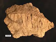 The reproductive organs of the Lepidodendrids consisted of strobili or cones on distal branches in the crown. In Synchysidendron the cones occur on late-formed crown branches, while in Diaphorodendron the cones occur on deciduous lateral branches.[19] The cones could grow to be considerably large, as in Lepidostrobus goldernbergii specimens are over 50 cm (20 in) long. The cones consist of a central axis with sporophylls arranged helically; sporangia are on the adaxial surface of the sporophylls and are upturned distally to overlap sporophylls above. Part of the sporophyll typically extends downward to create a heel or other distal extension. A ligule can be found in a small pit distal to the sporangium. Though Lepidostrubus is the most common name for Lepidodendrales cones, the name has been used for specimens of any form of preservation and for both monosporangiate and bisporangiate forms, so taxonomic problems often ensue.[5] Attempts to dissuade these taxonomic confusions have been made. Some have suggested the name Lepidostrobus should only describe monosporangiate cones and the name Flemingites describe bisporangiate cones, while others have used cone morphology to attempt to better differentiate species within Lepidostrobus.[20][21]