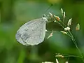 - Underside: white; costal margin and apex of forewing broadly, and the whole surface of the hindwing irrorated (speckled) with transverse, very slender, greenish strigae and minute dots; these on the hindwing have a tendency to form sub-basal, medial and discal obliquely transverse obscure bands; forewing: the postdiscal black spot as on the upperside; terminal margins of both forewings and hindwings with minute black, short, transverse slender lines at the apices of the veins, that have a tendency to coalesce and form a terminal continuous line as on the upperside. Antennae dark brown spotted with white, head slightly brownish, thorax and abdomen white. Female: similar, the black markings on the upperside of the forewing on the whole slightly broader, but not invariably so.[3][4]