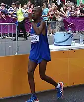 Competing in his first Olympics, Mosito Lehata was notable for carrying the flag of Lesotho in the closing ceremony.[15] He qualified for the Games because his fastest time, 20:63 seconds set in the 2012 African Championships in Athletics, met the "B" standard qualifying time for the men's 200 metres.[9][16] The International Association of Athletics Federations applied a rule where any competitor observed jumping the start would be disqualified. A spokesperson for the Lesotho Amateur Athletics Association noted that Lehata had previously jump started races in his career but did not expect him to violate the rule at the Olympics because of the athlete's slow reaction time.[17] Lehata competed in the fourth heat of the men's 200 metres on 7 August, finishing seventh (and last) of all competitors, with a time of 20.74 seconds.[18] Overall he finished 33rd out of 53 runners,[lower-alpha 2] and was unable to progress to the semi-finals because his time was 0.24 seconds behind the slowest qualifier.[18]