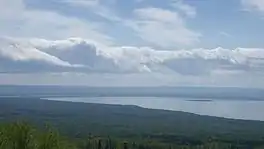 ![]() Southeast corner of the lake from Marten Mountain looking south with Dog Island, Devonshire Beach, and the Town of Slave Lake visible in the distance | |