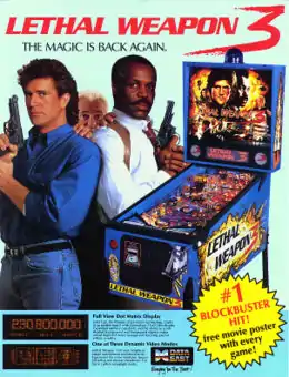 Lethal Weapon 3 is a pinball machine produced by Data East Pinball in 1992.[1] It is based on the movie of the same name, which was the most popular movie in summer 1992. The game featured a Generation 3 FullView dot matrix display, which was larger than the current industry standard, and displayed digitized movie clips.[1] The game also featured a hidden leveling system, in which players "grab hold of the Data East gun handle and eliminate bad guys in one of three video crime simulator shoot outs."[1] By 1994, it was Data East's all-time most successful pinball machine.[2] The game was designed by Markus Rothkranz.[3]
