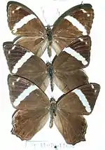 Underside uniform brown; forewings and hindwings with subbasal, subterminal and terminal sinuous lilacine-white lines; forewing with the oblique discal white bar as on the upperside, followed by a subapical lilacine patch bearing three small ocelli in vertical order, and with a very short, oblique, white bar joining it to the costa. Hindwing with a sinuous, irregular, angulated discal lilacine-white line and a strongly arched series of black ocelli speckled with white in the centre, with an inner ochraceous, intermediate brown, and outer lilacine ring. Antenna, head, thorax and abdomen dull brown; antennae ochraceous at apex.[1] Wingspan: 54–64 mm.