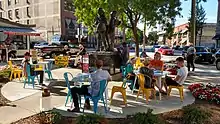In 2019, the space was improved again and re-christened Postman's Porch. The space was redesigned to become more open by removing hedges and adding additional plaza space.[4] Reading materials, tables and chairs and festive banners were also added.[4] A series of concerts were held to create a spirit of community gathering.[4]