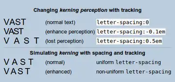 With CSS1, a standard of 1996, the letter-spacing property (illustrated) offers some control for "kerning perception", as kerning can be simulated with non-uniform spacing between letters. The CSS3 standard includes the font-kerning property.[5] In the meantime, web designers used the workaround of letter-spacing, mainly to enhance spaced texts of titles and banners.