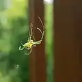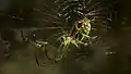 Leucauge venusta, known as the orchard spider, is a long-jawed orbweaver spider that occurs from southern Canada to Colombia, along the East coast, reaching into the central US, also in South Asia.The web is often oriented horizontally, with the spider hanging down in the center.