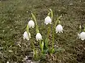 The two species of Leucojum have been described as "tough garden plants for damp soils". Both grow well in gardens in western Europe, with sufficient rainfall so that the soil does not dry out completely in summer. L. aestivum, the summer snowflake, grows particularly well on clay soils. L. vernum, the spring snowflake, is easy to grow in moist sunny or semi-shady places and flowers along with snowdrops.[6][12] Re-planting soon after lifting is recommended. Bulbs that have dried out either fail to grow or take a long time to establish. They can be propagated from seed as well as by division. Seeds require a period of cold in order to germinate and take 4–5 years to reach flowering size.[6]
