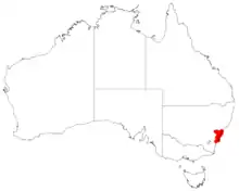 Leucopogon amplexicaulis ranges from the Sydney Basin south to Shoalhaven on the New South Wales South Coast. It is found on sandstone soils in sclerophyll forest, where it grows in sheltered locations on sandstone outcrops and platforms, often near natural seepage.[1] In the Sydney region it is associated with trees such as Sydney peppermint (Eucalyptus piperita), red bloodwood (Corymbia gummifera) and smooth-barked apple (Angophora costata), and shrubs such as heath banksia (Banksia ericifolia), coral fern (Gleichenia dicarpa) and dog rose (Bauera rubioides).[6]
