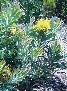 Leucospermum formosum is a large upright shrub of up to 3 m (10 ft) high, from the family Proteaceae. It grows from a single trunk and its branches are greyish felty. The softly felty leaves are lance-shaped to elliptic, 6½–10 cm (2½–4 in) long and 14–20 mm (0.56–0.80 in) wide. The flower heads are flattened and about 15 cm (6 in) across, and consist of bright yellow flowers from which long, styles emerge which are strongly clockwise bent just below the white, later pink thickened tip. From above, the heads look like turning wheels. It is called silver-leaf wheel-pincushion in English. It flowers during September and October. It is an endemic species of the Western Cape province of South Africa.[3][4]