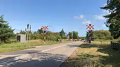 In Finland, level crossings with warning lights have the more common red light(s) and a white light that flashes except when the red light(s) flash. Most, but not all, crossings with lights also have barriers. Full-length barriers are usually used only for pedestrian and bicycle lanes. Half-length barriers are used for motor roads, to avoid the risk of a vehicle being trapped on the tracks between the barriers. Bells begin to ring when the red lights start flashing and usually stop when the barriers have come down. Red-and-yellow crossbucks are used on both controlled and Sweden style crossing uncontrolled level crossings. If there are two or more tracks, the lower part of the cross is doubled. Only minor agricultural crossings may have no signs at all. On bigger roads there are usually also approach signs. Finnish level crossings are the sixth safest in Europe.[4] Finland's state railway system has almost 3000 level crossings, according to TraFi.[5] In Finland over the course of railway history many level crossing accidents have occurred, in comparison to Scandinavian countries.[6] In Finland the maximum speed for trains on the rails with level crossings is 140 km/h.[7]