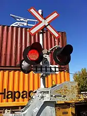 A majority of the level crossings in India are manually operated.[30] Signals and barriers are installed at all crossings while manual crossings are additionally required to have the hand red and green signal lamps. Indian Railways aims at elimination of all unmanned crossings and replacing them with manned crossings.[31]