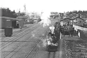 The station was opened by the Wellington and Manawatu Railway Company (WMR) in 1886 as an intermediate station on the Wellington-Manawatu Line. The first station was built in the northern part of Levin near Tyne Street, and was replaced in 1894–95 by a station near the centre of Levin. In 1909 this station was destroyed by fire, and replaced by a station 10 chains (200m) south. There was a nearby station in the southern part of Levin at Weraroa from c1886 to 1894.