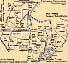 Levittown's 41 neighborhoods[23] (locally called "sections") are found in parts of four separate municipalities: