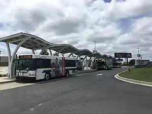 The Lewes Transit Center is located southwest of the city of Lewes in Sussex County, Delaware. The transit center is located along the south side of U.S. Route 9/Delaware Route 1 (Coastal Highway) a short distance east of the Five Points intersection, with access from the southbound lanes.[1][2] The park and ride is located at the northern edge of the Delaware Beaches region, allowing for transfer to bus services before motorists reach heavier traffic along DE 1 approaching Rehoboth Beach. Buses utilize bus lanes along DE 1 between the Lewes Transit Center and Rehoboth Beach, bypassing traffic congestion.[3] The Lewes Transit Center features a bus loop that buses pull into to pick up and drop off passengers. Located south of the bus stop is a park and ride lot with 248 parking spaces along with an indoor passenger facility featuring seating, restrooms, a ticket sales office, and monitors displaying real-time bus information. Other amenities at the Lewes Transit Center include bicycle racks, benches that feature solar-powered charging stations, and an electric vehicle charging station.[2][3]