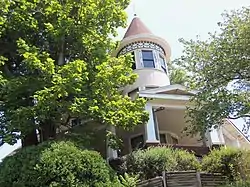 The Lewis M. Fisher house sits prominently on a corner lot that features a steep a terrace. The plan and the massing of the house, along with the three-story corner tower, reflects the Queen Anne style. The gable-end pediments and the Palladian window are Neoclassical decorative elements. Combining these elements in a single structure was common of houses built in the late 19th century.[3]
