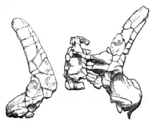 In the early 1880s collector Alfred Nicholson Leeds acquired a skeleton of a dinosaur excavated at a small brick pit at the hamlet of Tanholt, close to Eye, Cambridgeshire. In September 1885 the remains were shown to paleontologist Henry Woodward whose notes form the first documentation on the subject. Later it was mistakenly assumed the find had been made at the industrial brick pits at Fletton, the usual source of Leeds' specimens.[1] In 1887 the fossil was described by John Whitaker Hulke and named as a new species of the stegosaurian Omosaurus: Omosaurus durobrivensis. The specific name referred to the old Roman town of Durobrivae.[2] On 30 May 1892 the specimen was bought by the British Museum of Natural History.[1]