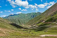 The Lhasa River forms where three smaller rivers converge. These are the Phak Chu, the Phongdolha Chu which flows from Damxung County and the Reting Tsangpo, which rises beyond the Reting Monastery.[12] The highest tributary rises at around 5,290 metres (17,360 ft) on the southern slope of the Nyenchen Tanglha Mountains.[13] In its upper reaches the river flows southeast through a deep valley.[14] Lower down the river valley is flatter and changes its direction to the southwest, The river expands to a width of 150 to 200 metres (490 to 660 ft).[14] Major tributaries in the lower reaches include the Pengbo River and the Duilong River.[15] At its mouth the Lhasa Valley is about 3 miles (4.8 km) wide.[16]