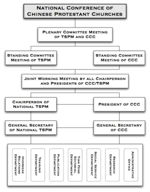 The TSPM and CCC together form the constituent organizations of the National Conference of Chinese Protestant Churches.[1] The distinctive roles of the TSPM and CCC are hard to distinguish due to overlaps but both organizations maintain separate Standing Committees.