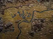 The Liangzhu Ancient City is located in a wetland environment on the plain of river networks between Daxiong Mountain and Dazhe Mountain of the Tianmu Mountain Range. This ancient city is said to be the largest city during this time period. Its interior area is 290 hectares, surrounded by clay walls which had six city gates. Two gates were located in the north, east and south walls. At its center was a palace site that spanned 30 hectares and there was also evidence of an artificial flood protection design implemented within the city. Both of these constructions are said to be indicators of the social complexity developing in Liangzhu at the time. A granary may have been in place containing up to 15,000 kg of rice grain. There are numerous waterway entrances both inside and outside of the city, linking it to the river networks. Inside the city were artificial earth mounds and natural hills. Outside of the walled area, remains are found for 700 hectares, the residences are said to be built in an urban planning system. 8 kilometers to the north various dam-like sites were found and are speculated to be an ancient flood protection system. Also discovered inside and outside the city are a large number of utensils for production, living, military and ritual purposes represented by numerous delicate Liangzhu jade wares of cultural profoundness; the remains including city walls, foundations of large structures, tombs, altars, residences, docks and workshops. The Liangzhu city-site is said to have been settled and developed with a specific purpose in mind since this area has very few remains that can be traced back to earlier periods.[14] At its peak, the city might have been inhabited by 34,500 people.[9]