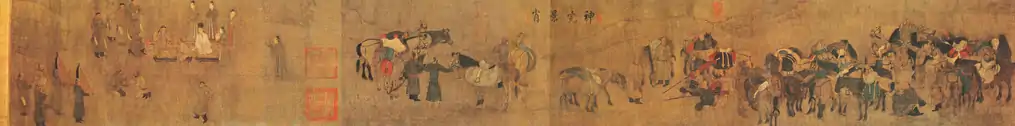 There were eight Khitan tribes: the Xiwandan, Hedahe (Adahe), Fufuyu (Jufufu), Yuling (Yuyuling), Rilian, Piqie (Pilier), Li (black), and Tuliuhan (Tuliuyu).[19] The eight tribes shared power by rotating leadership triennially.[20] The Khitan federation presented tribute to the Northern Yan (409-436), which in return invested the Khitan khan as Prince Guishan. The Khitans also regularly presented tribute to the Northern Wei (386-534) court in the form of horses and animal skins. Trade occurred on the border in Helong (modern Chaoyang) and Miyun. In 553, the Khitans suffered a defeat to the armies of Northern Qi (550-577) and lost a large portion of their population as well as cattle. For a time they resided in Goguryeo.[21] In 584, they submitted to the Sui dynasty (581-618). In 605, they were attacked by the Türks and lost 40,000 men and women.[21] The eight tribes of old dispersed. Only two Khitan leaders are known from this period: Hechen and Wuyu. The title of Khitan chieftains was Mofuhe or Mohefu.[21]