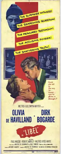 Libel is a 1959 British drama film[2][3] starring Olivia de Havilland, Dirk Bogarde, Paul Massie, Wilfrid Hyde-White and Robert Morley. The film's screenplay was written by Anatole de Grunwald and Karl Tunberg from a 1935 play of the same name by Edward Wooll.[4]