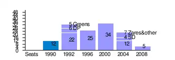 The LDS dominated Slovenian politics during the first decade following independence. Except for a brief interruption in 2000, it held the parliamentary majority between 1994 and 2004, when it lost the election to the conservative Slovenian Democratic Party. The loss was followed by decline, infighting and political fragmentation. In the runup to the 2008 parliamentary election the LDS joined in an unofficial coalition with the Social Democrats and Zares, but lost nearly 80% of its seats, dropping from 23 to just 5 and becoming the smallest parliamentary party. In the 2011 parliamentary election on 4 December 2011, its support collapsed even further: it won only 1.48% of the vote, not reaching the parliamentary threshold of 4%.[8]