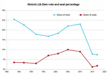 Heading into the 2019 general election, the party polled well, with one poll showing the party with 20% (within 4% of Labour) as late as 28 October.[142] Nonetheless, during the campaign period the party's fortunes dwindled, and leader Jo Swinson received negative reviews.[143][144] In the election, the Liberal Democrats lost ten seats from the previous parliament and one from the previous election, returning 11 MPs. Of the nine new MPs who joined between June and October 2019, the eight who contested their seats in the 2019 general election all lost their seats. However, the party did gain 4.2% in the vote, rising to 11.6%. Swinson herself narrowly lost her East Dunbartonshire constituency to the Scottish National Party's Amy Callaghan, and Swinson was forced to resign as leader the next day as the Liberal Democrat Constitution, which mandates that the leader must also serve as an MP, meant she was disqualified from holding the party leadership.[145] Deputy Leader Ed Davey and Party President Sal Brinton then jointly assumed the positions of acting co-leaders of the party. Brinton was at the end of the year (31 December 2019) replaced by Mark Pack as Party President and acting co-leader[146] while Mike Dixon remains the party CEO.[147]