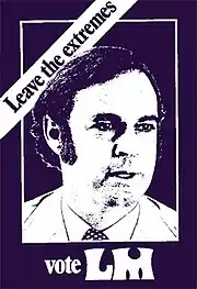 At the 1975 state election the LM had ambitions of becoming the largest non-Labor party.[72] The campaign was focused primarily on accusations of mismanagement of the economy by Labor, with the LM seeking to positioning itself between the Liberals and Labor, as the centre-ground of South Australian politics. Advertisements attacked the Liberal Party for being a conservative party, and Labor for its perceived socialism and poor economic record. At the time, inflation and unemployment was increasing.[89][90] The LM slogan was "Vote LM—You know it's right".[91] Despite now being a federal senator, Hall was still synonymous with the LM at state level and he was central in the party's advertising.[91] The momentum was against Labor, and it was expected that the election could come down to whether Labor would retain their marginal urban seats. The LM proposed to the Liberals to have a joint candidate in the marginal metropolitan seat of Gilles—which required a two-party preferred swing of 6%[92]—to maximise their chances. The Liberals agreed but wanted the joint candidate to stand in Unley, and no agreement was reached.[93]