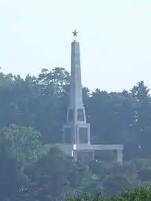 The Liberation Monument is a monument in Pyongyang, North Korea. It was built in 1947 to honour Red Army soldiers who took part in liberating Korea from Imperial Japanese occupation during the final stage of the Second World War. Soviet paratroopers took control of Pyongyang on August 24, 1945. The monument is composed of a stele surmounted by a five-pointed red star, with the entire structure attaining a height of 30 meters. The square base of the monument bears an inscription on each of its sides. The text, in Russian and Korean, describes the purpose of the monument. The monument is often visited by official delegations as well as by tourists and city residents. It has become traditional for newlywed couples to visit the monument as well.