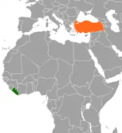 Liberia–Turkey relations are the foreign relations between Liberia and Turkey. The Turkish ambassador in Accra, Ghana is also accredited to Liberia since 2013.[1] Liberian Embassy in Brussels is accredited to Turkey.[1] Turkey will be opening an embassy in Liberia’s capital Monrovia 'as soon as possible.'[1]