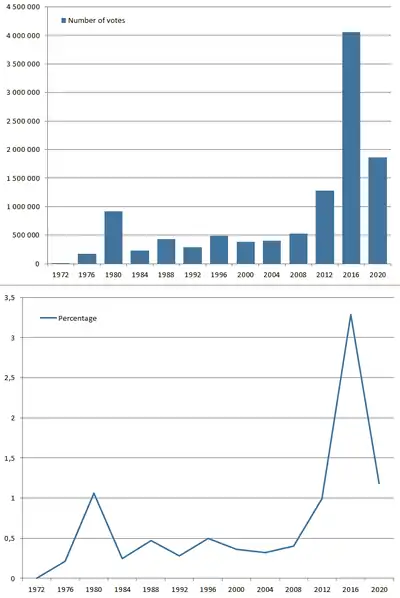 During the 2016 presidential election, Gary Johnson and vice presidential candidate Bill Weld received a record percentage of 3.3% of the popular vote (4,489,233 votes),[64] getting 9.3% in New Mexico, where Johnson had previously been elected governor. In the 2012 presidential election, Johnson and running mate Jim Gray received 1,275,821 votes (1.0%).[65]