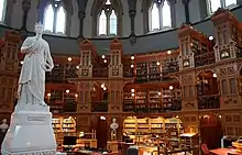 The main reading room rises to a vaulted ceiling and the walls and stacks are lined with white pine panelling carved into a variety of textures, flowers, masks, and mythical creatures. In the galleries are displayed the coats of arms of the seven provinces that existed in 1876, as well as that of the Dominion of Canada, and standing directly in the centre of the room is a white marble statue of Queen Victoria, sculpted by Marchall Wood in 1871.[5] The northern galleries are also flanked with the white marble busts of Sir John Sandfield Macdonald; Prince Edward, Prince of Wales (later King Edward VII); Alexandra, Princess of Wales (later Queen Alexandra); and Sir Étienne-Paschal Taché.[7]