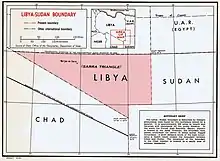 In 1925 Britain and Italy signed a boundary treaty, whereby the 22nd parallel north was utilised starting at the tripoint with Egypt and proceeding westward, terminating at the border between Italian Libyan and French Equatorial Africa (i.e. the modern Chad-Libya border).[3][2] The north-west corner of Anglo-Sudan Egyptian thus created was referred to as the Sarra Triangle; this latter area was ceded to Italy on 20 July 1934, and the boundary re-drawn at its current position.[2] On 7 January 1935 France and Italy signed a treaty which shifted the French Equatorial Africa-Libya boundary southwards (creating the Aouzou Strip, thereby also shifting the Libya-Sudan southwards slightly, however this agreement was never formally ratified by both parties and was thus never implemented.[7][2]