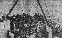 The lifeboat was launched without its plug, causing water to leak into the bottom of the boat. As Gibson later put it, "this was remedied by volunteer contributions from the lingerie of the women and the garments of men."[33] Those aboard had to sit for hours with their feet soaking in ice-cold water.[34] When Titanic went down at 2:20 a.m., the noise of hundreds of people screaming for help was heard by the lifeboat's occupants, a sound that Gibson said would "remain in my memory until the day I die." Hogg wanted to turn back to pick up some of those in the water, but was shouted down by the boat's occupants.[35] They drifted for some time until they came within reach of Boat 5. The officer in charge of the latter decided to transfer a number of survivors from his boat, which he thought was overcrowded, into No. 7.[36] The two boats were lashed together for the rest of the night until they separated to meet the RMS Carpathia.[37]
