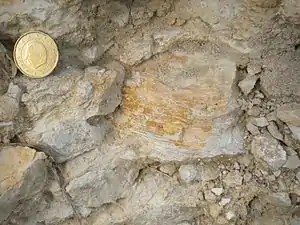 The changeover to the overlying Angoumian is very progressive but can be defined by the first appearance of detritic layers, pellets of different sizes and quite common annelid tubes as well as by the disappearance of the pelagic forams. The lower 5 to 8 meters of the Angoumian cannot really be separated from the Ligérian in the field and are therefore most often attributed to the Ligérian on geological maps.