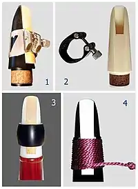 A ligature is a device which holds a reed onto the mouthpiece of a single-reed instrument such as a saxophone or clarinet. The ligature must secure the reed firmly against the table of the mouthpiece while allowing it to vibrate freely.[1] The earliest ligatures were lengths of string wrapped over the reed and tied. Iwan Müller invented a metal ligature to replace twine.[2] String is still used by clarinetists, especially in Germany. Modern German mouthpieces have a groove cut into the outside of the mouthpiece to facilitate wrapping with a string ligature. Some modern clarinetists even opt to use shoestring as a ligature substitute as it is more easily adjustable than string. [3] Other modern clarinetists use electrical tape as a ligature.