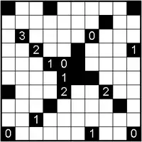 Light Up is played on a rectangular grid of white and black cells. The player places light bulbs in white cells such that no two bulbs shine on each other, until the entire grid is lit up. A bulb sends rays of light horizontally and vertically, illuminating its entire row and column unless its light is blocked by a black cell. A black cell may have a number on it from 0 to 4, indicating how many bulbs must be placed adjacent to its four sides; for example, a cell with a 4 must have four bulbs around it, one on each side, and a cell with a 0 cannot have a bulb next to any of its sides. An unnumbered black cell may have any number of light bulbs adjacent to it, or none. Bulbs placed diagonally adjacent to a numbered cell do not contribute to the bulb count.