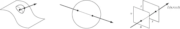 Some alternative parameterizations of the 4D light field, which represents the flow of light through an empty region of three-dimensional space. Left: points on a plane or curved surface and directions leaving each point. Center: pairs of points on the surface of a sphere. Right: pairs of points on two planes in general (meaning any) position.