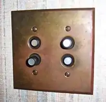 The push-button light switch has two buttons: one that closes the contacts and one that opens the contacts. Pushing the raised button opens or closes the contacts and pops out the previously depressed button so the process can be reversed. In the U.S., the buttons were commonly black; the "on" button typically had a white mother-of-pearl (real or simulated) inlay to indicate its function. By convention, the switch was customarily installed with the "on" button on top. Push-button switch reproductions are available on the market today for vintage or authentic styling.