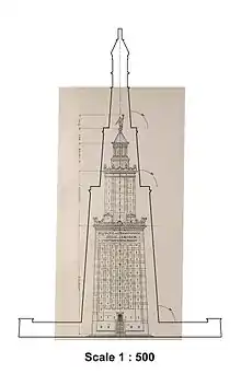 The Arab authors indicate that the lighthouse was constructed from large blocks of light-coloured stone. The tower was made up of three tapering tiers: a lower square section with a central core; a middle octagonal section; and, at the top, a circular section.[15] Al-Masudi wrote in the 10th century that the seaward-facing side featured an inscription dedicated to Zeus.[16] Geographer Al-Idrisi visited the lighthouse in 1154 and noted openings in the walls throughout the rectangular shaft with lead used as a filling agent in between the masonry blocks at the base. He reckoned the total height of the lighthouse to be 300 dhira rashashl (162 m).[17]
