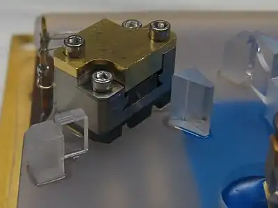 Lightwave Electronics is listed as the assignee on 51 United States patents.[3] Several of these relate to active laser stabilization, including stabilization of optical frequency,[26] of intensity,[27] and of pulse repetition rate[28] and pulse energy.[29] Another set relate to laser manufacturing techniques. Early Lightwave Electronics lasers used solder to permanently mount optics in place.[30] Later lasers, such the one shown in the figure, used adhesive cured by ultraviolet light.[23][31]