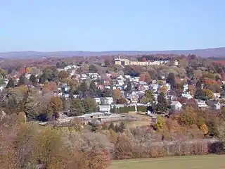 Ligonier enjoyed a new attention when the Ligonier Valley Railroad was completed in 1877, linking the community to Latrobe where connections to the Pennsylvania Railroad were possible.[8] The Ligonier Valley Railroad enabled lumber, coal, and quarried stone to be transported out of the Ligonier Valley, which spurred development of the town. Additionally, the railroad made it easier for Pittsburgh residents to visit Ligonier, causing the town to develop as a summer resort. Some major physical changes to Ligonier occurred during this period. In 1894, the Diamond, which had been used as a corral for horses and wagons, was transformed into a park with a bandstand. A large hotel, the Hotel Breniser, was built in 1900 where the town hall currently sits.[7][9] In 1909–1910, the Ligonier Valley Railroad built an ornate station and headquarters building, which still stands at 339 West Main Street.